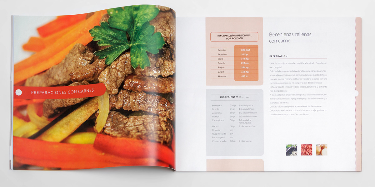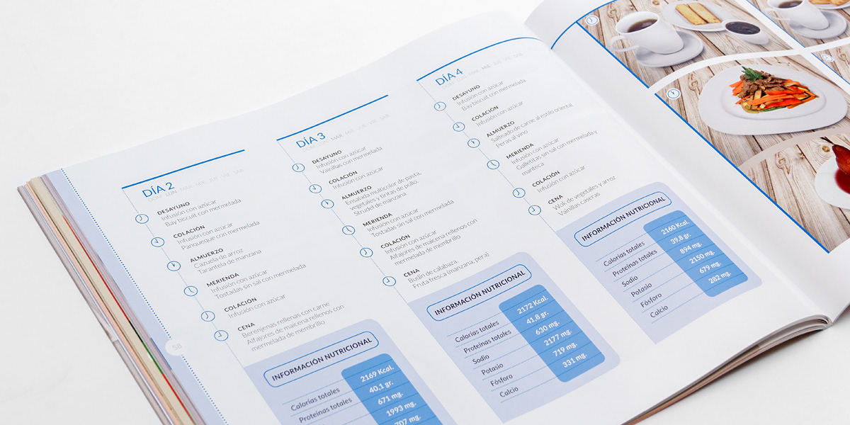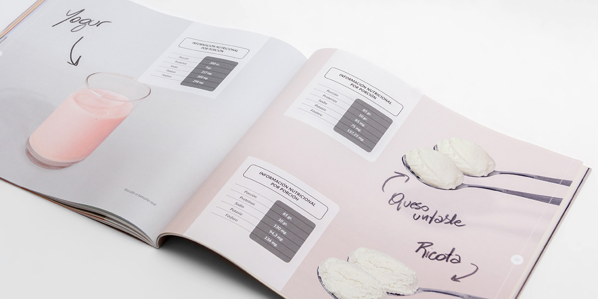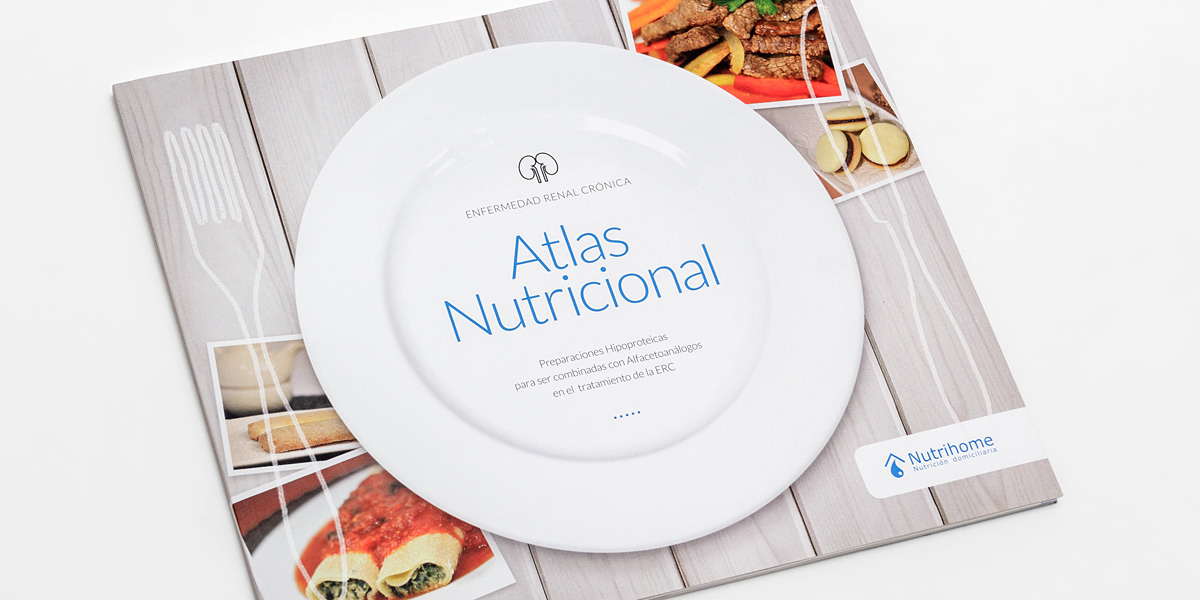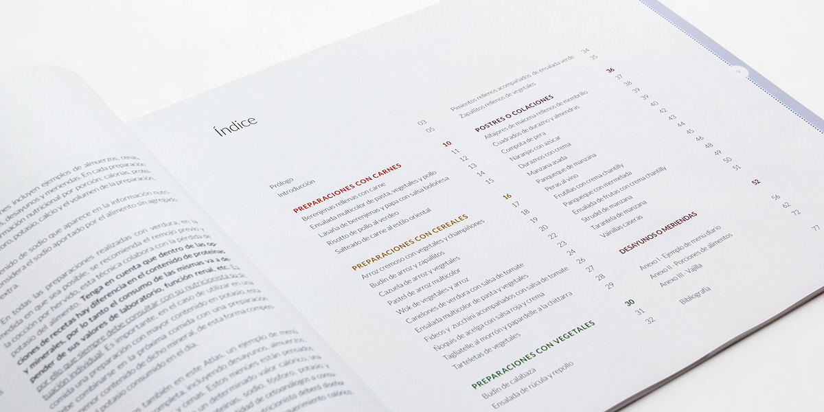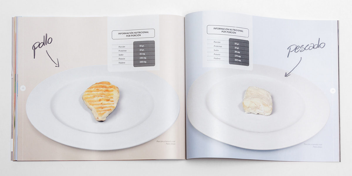Atlas Nutricional para pacientes de Enfermedad Renal Crónica, para Nutrihome. Se ideó un tamaño donde, al finalizar las descripciones de las recetas, se vean las porciones y vajillas en tamaño real.